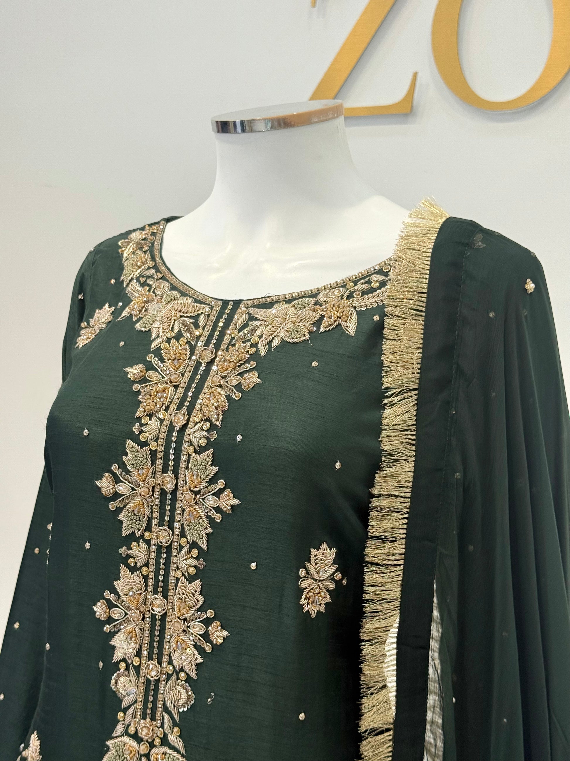 A timeless three-piece raw silk ensemble featuring intricate hand embroidery on the kameez, paired with matching raw silk plazo trousers. The look is completed with a soft chiffon dupatta, finished by hand and edged with classic kiran lace, perfect for festive and formal occasions.