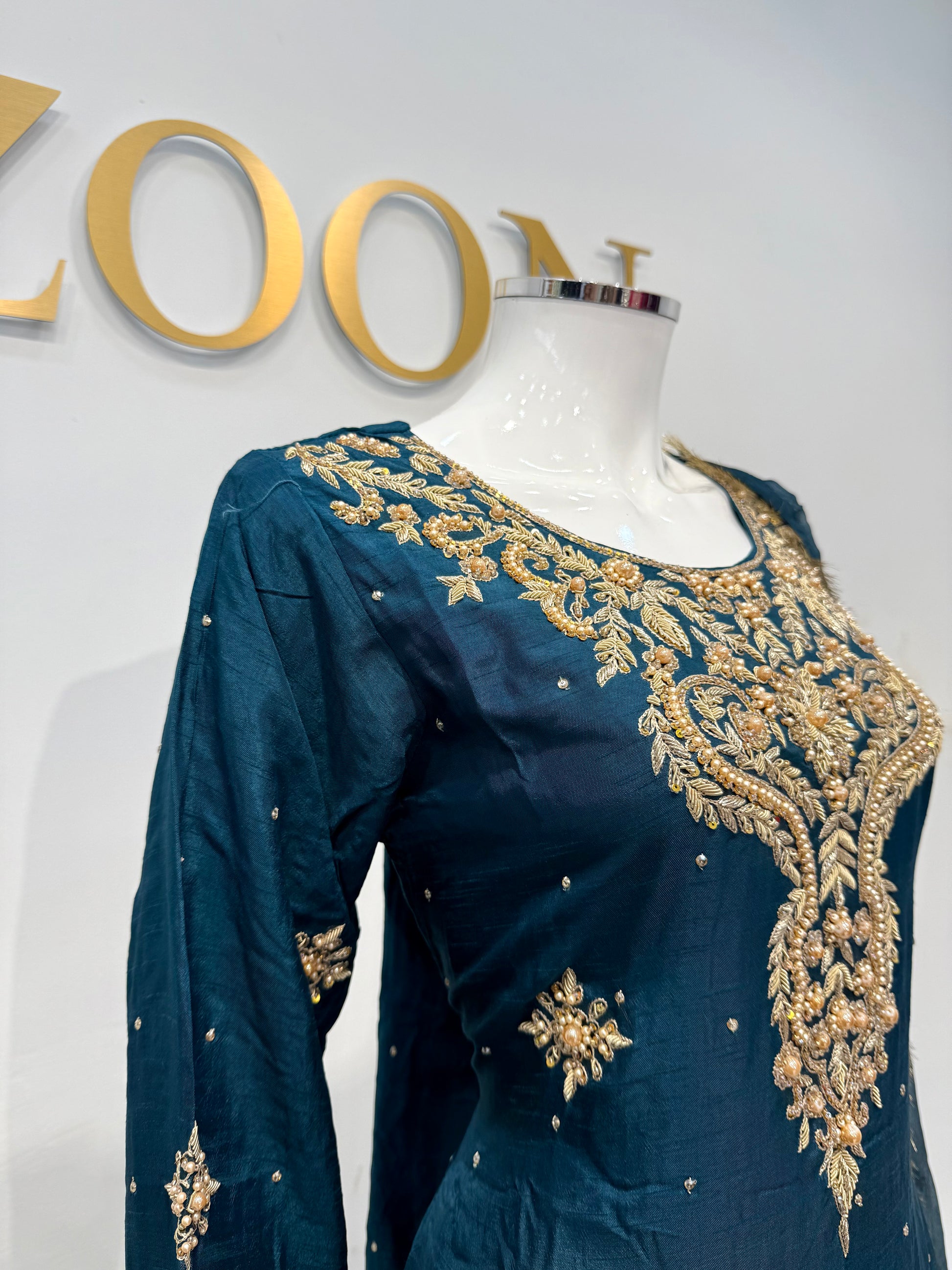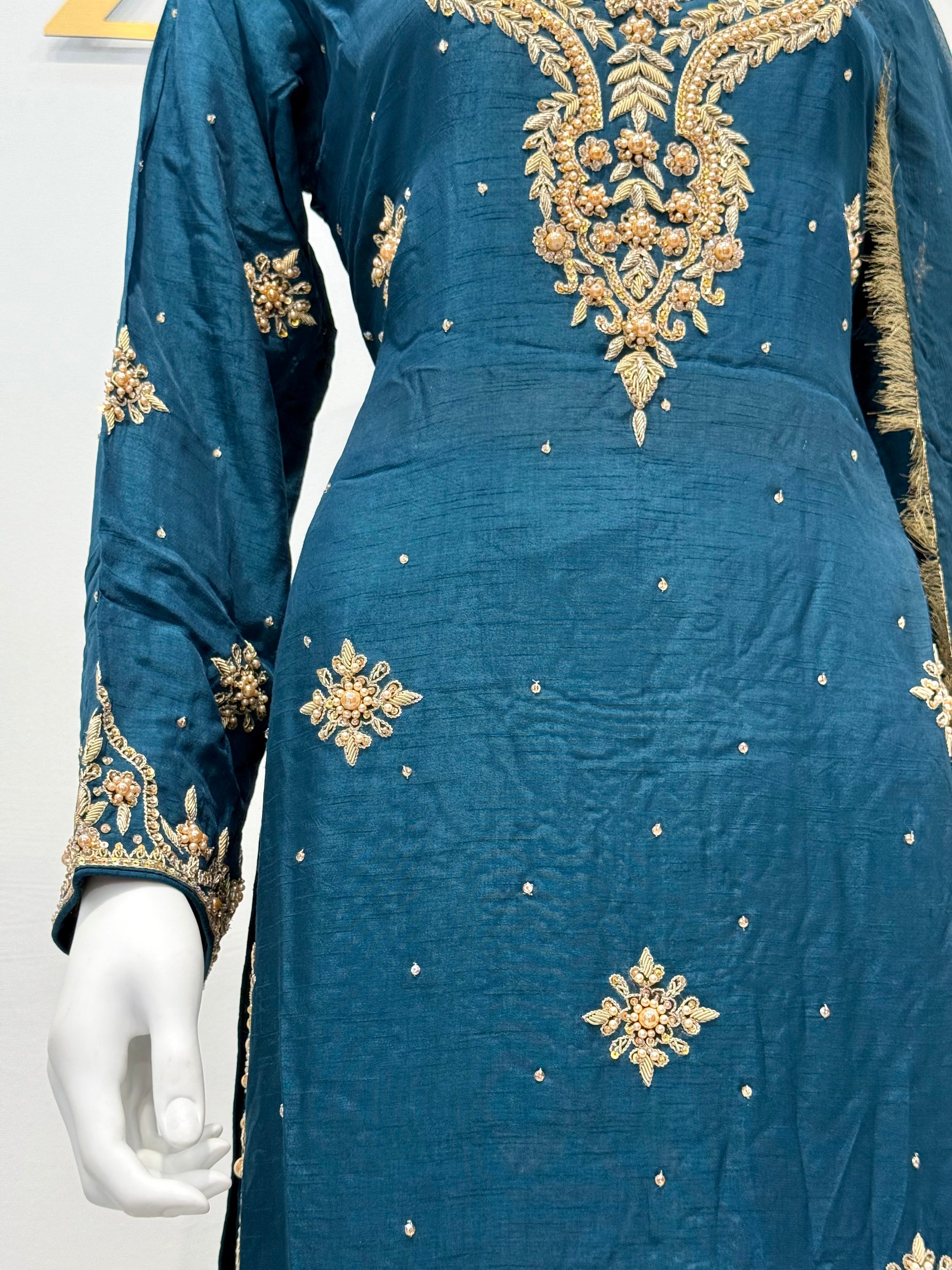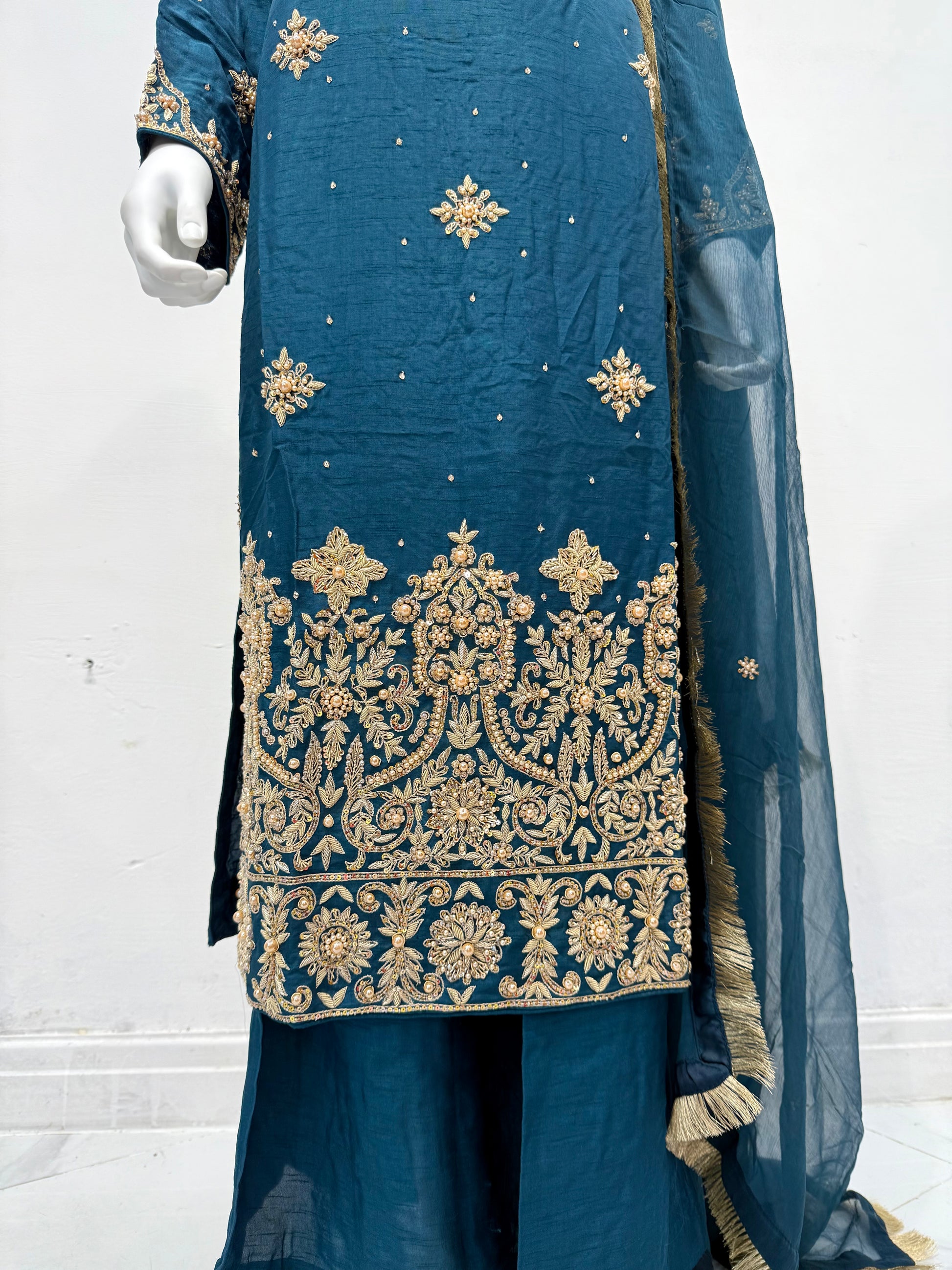 A timeless three-piece raw silk ensemble featuring intricate hand embroidery on the kameez, paired with matching raw silk plazo trousers. The look is completed with a soft chiffon dupatta, finished by hand and edged with classic kiran lace, perfect for festive and formal occasions.