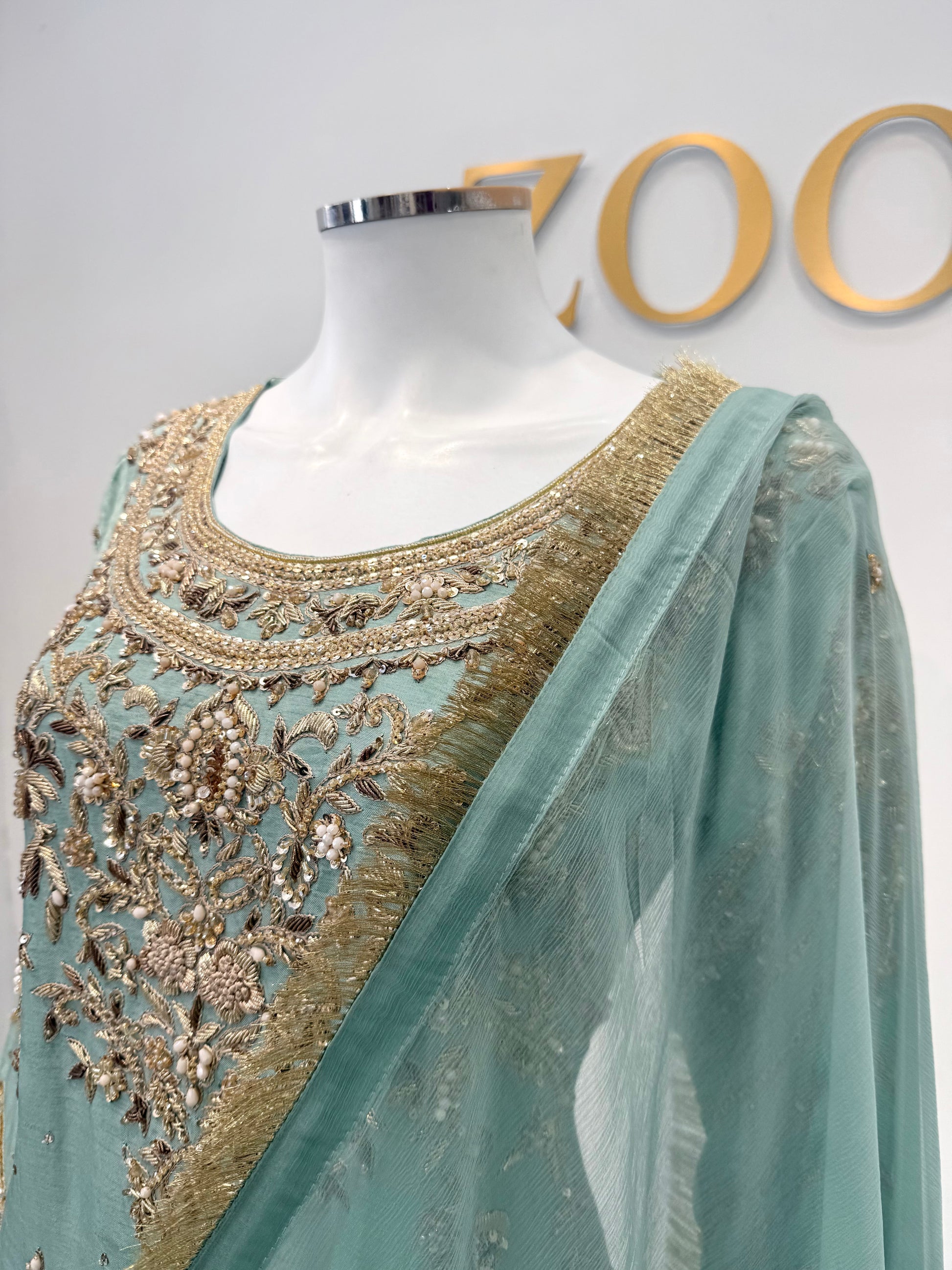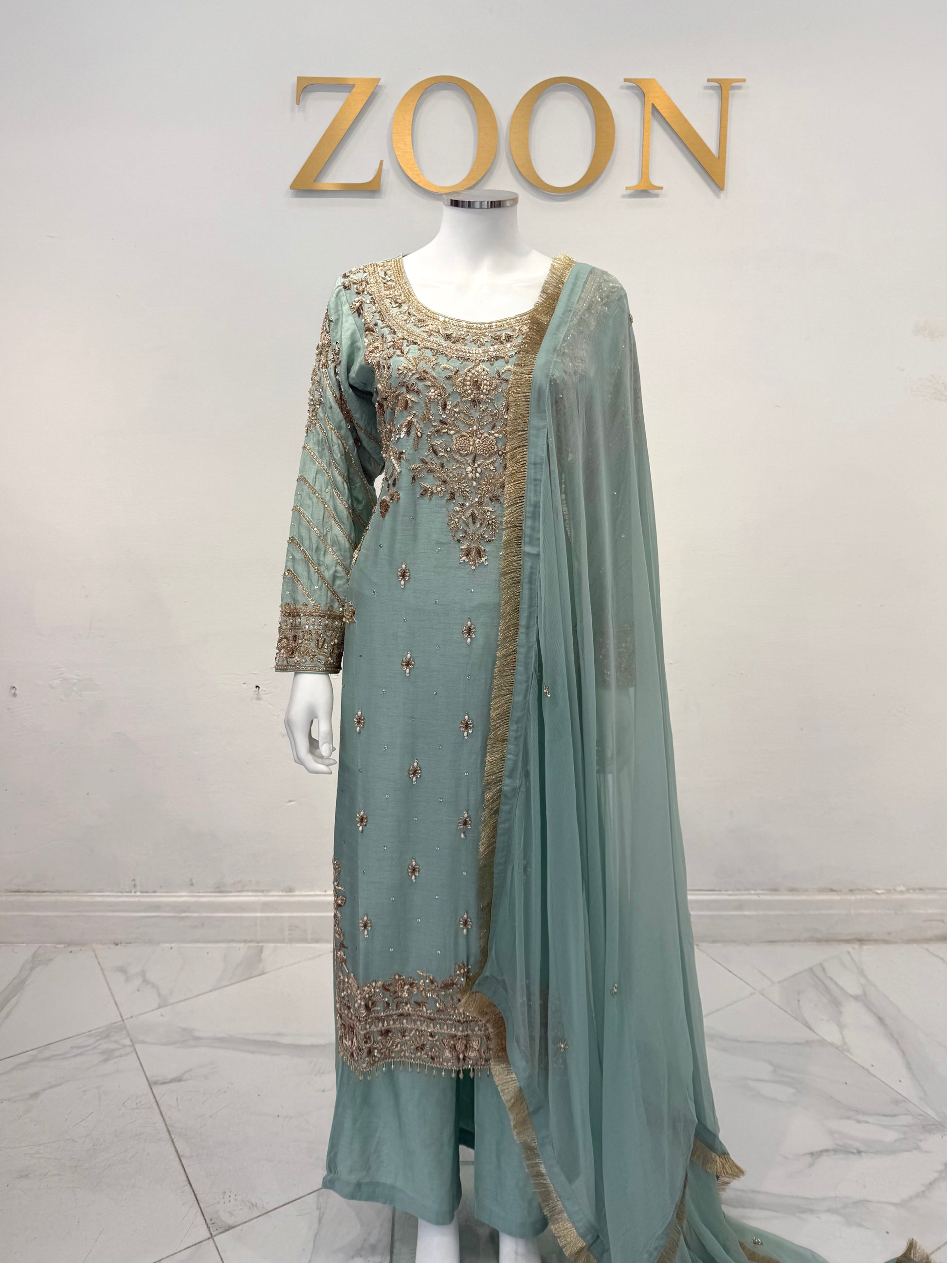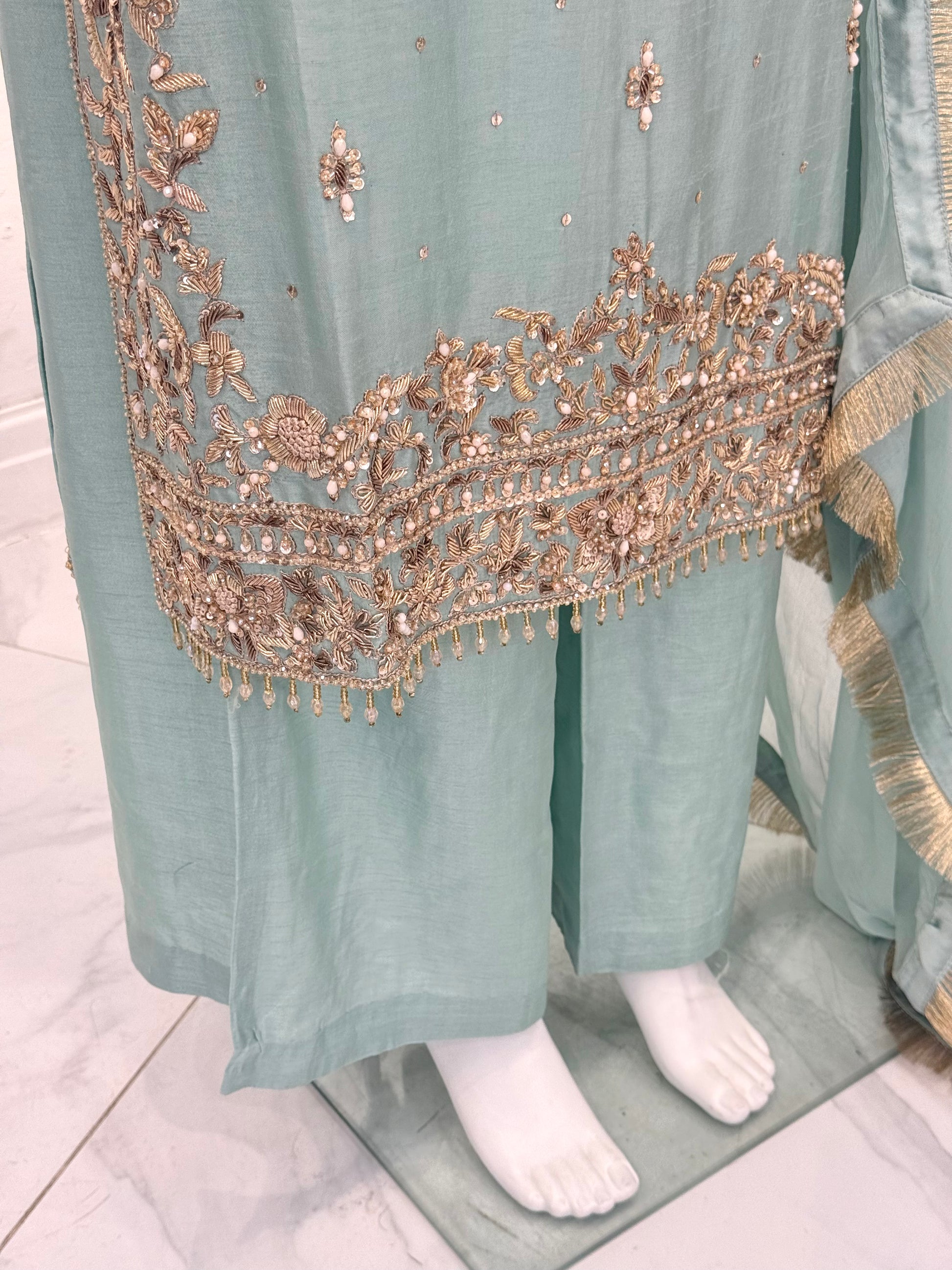 A timeless three-piece raw silk ensemble featuring intricate hand embroidery on the kameez, paired with matching raw silk plazo trousers. The look is completed with a soft chiffon dupatta, finished by hand and edged with classic kiran lace, perfect for festive and formal occasions.