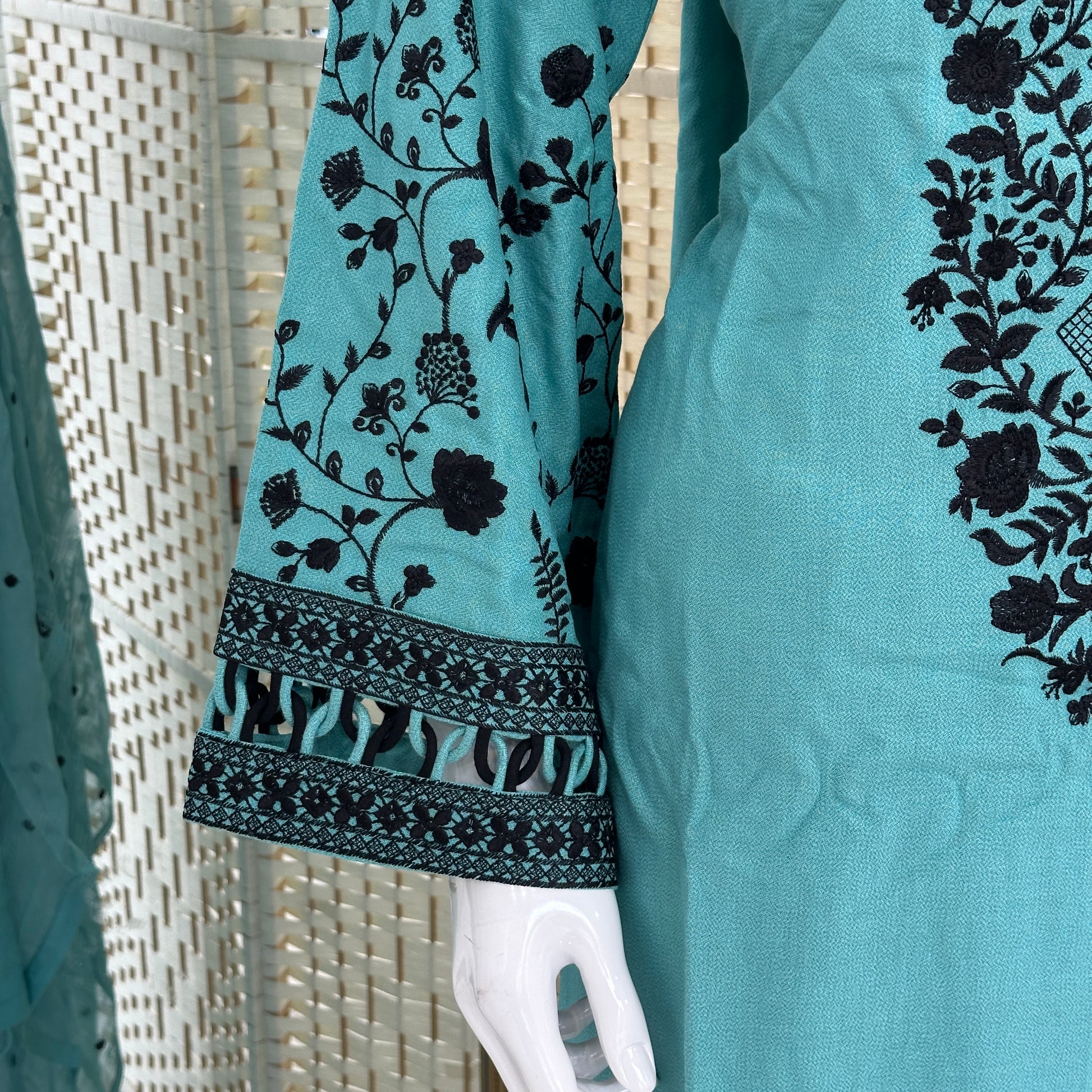 - Floral embroidered sleeves are flared towards the cuff and finished with a unique chain loop link design, which adds a unique and stylish touch to the outfit.
