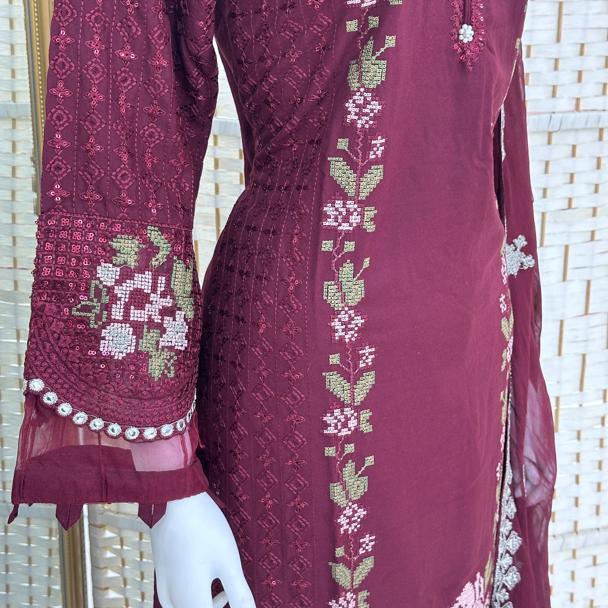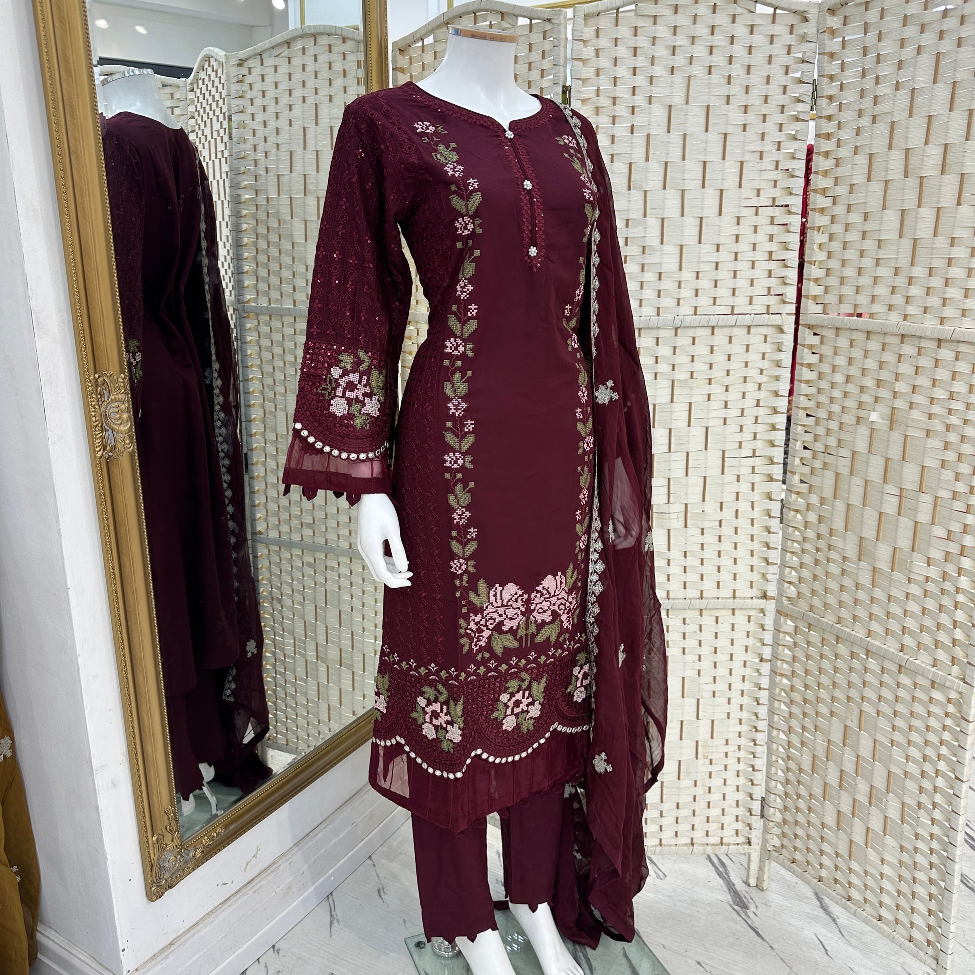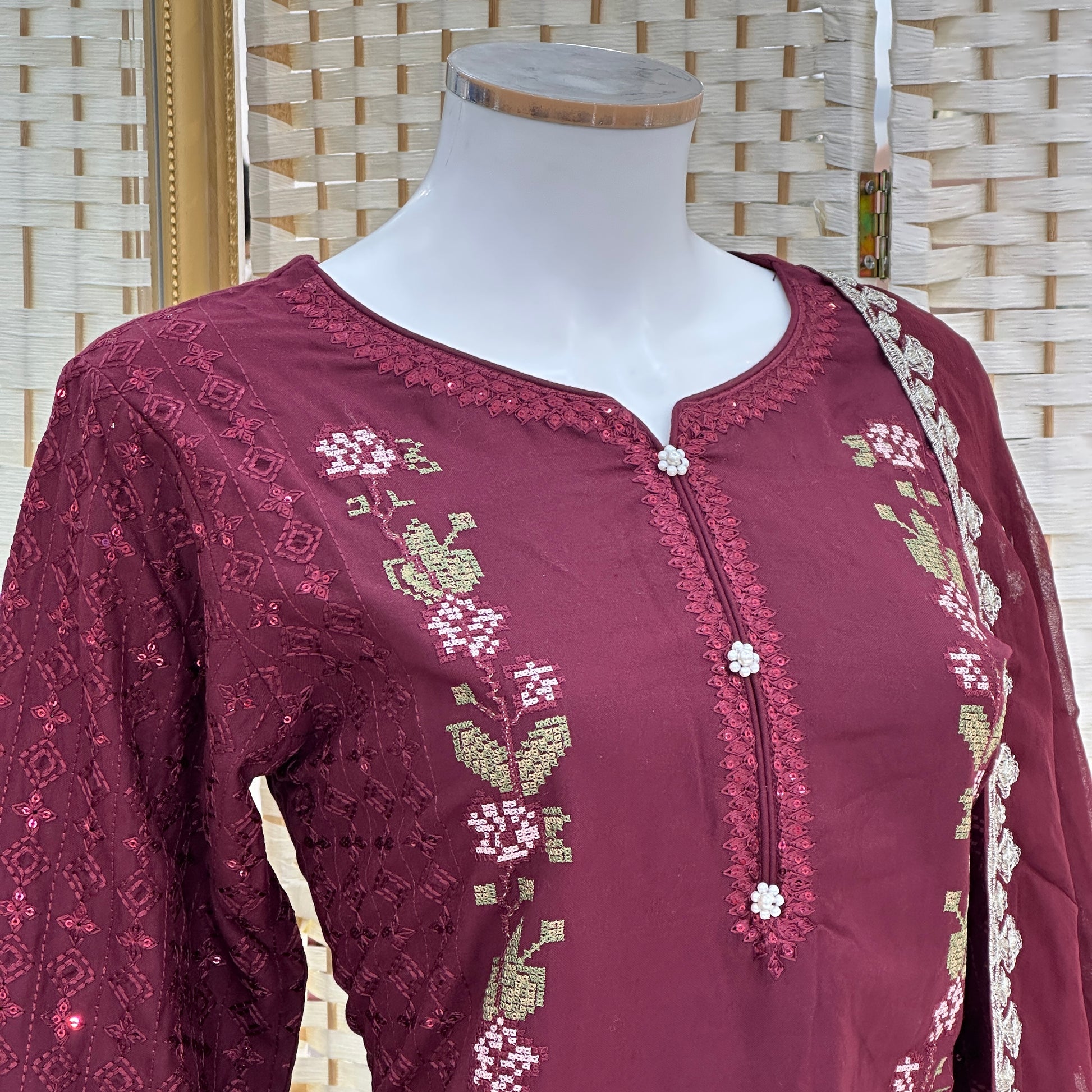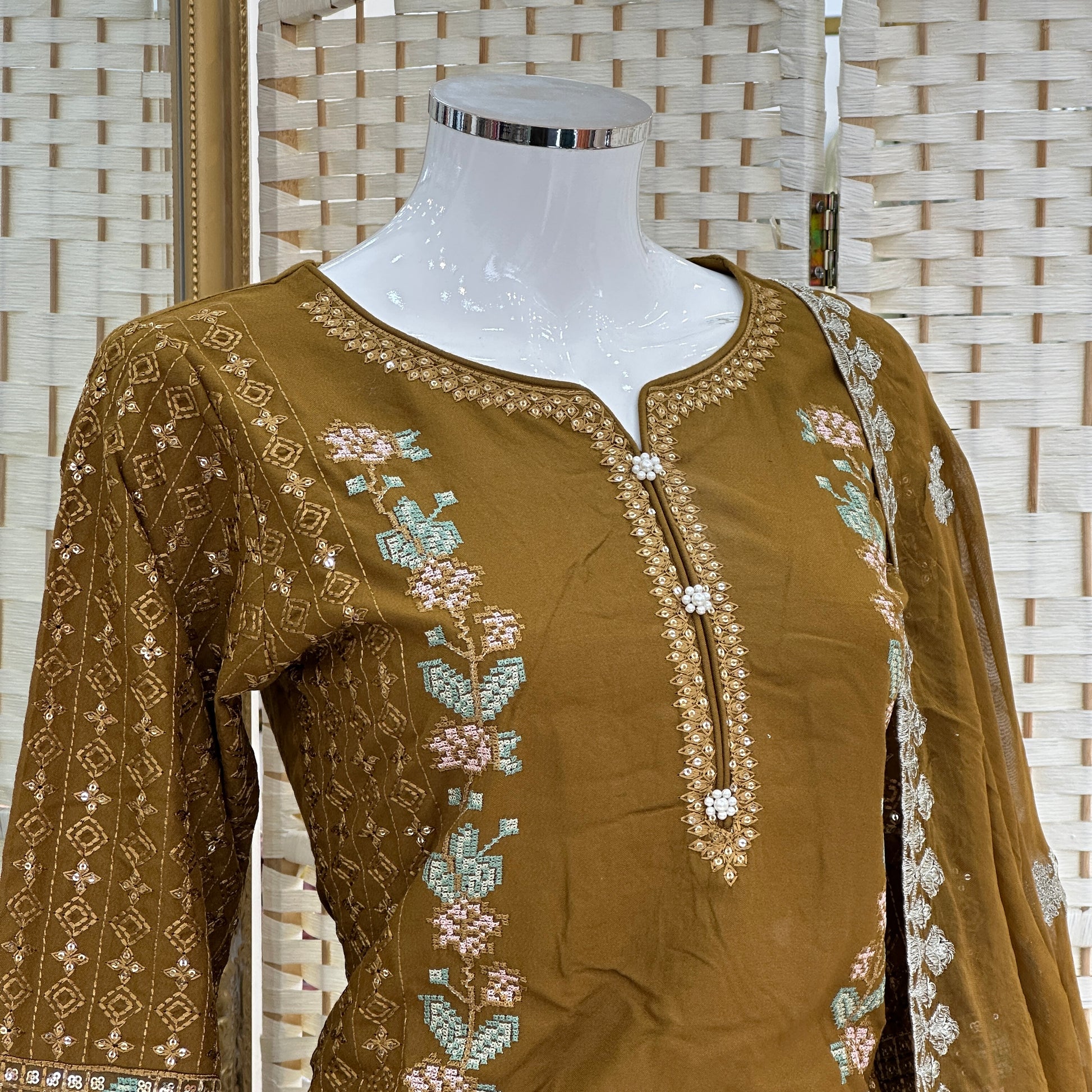 Elevate your wardrobe with this 3 piece luxury marina cotton suit. It includes a beautiful cross-stitch embroidered kameez, matching trousers, and a chiffon dupatta.