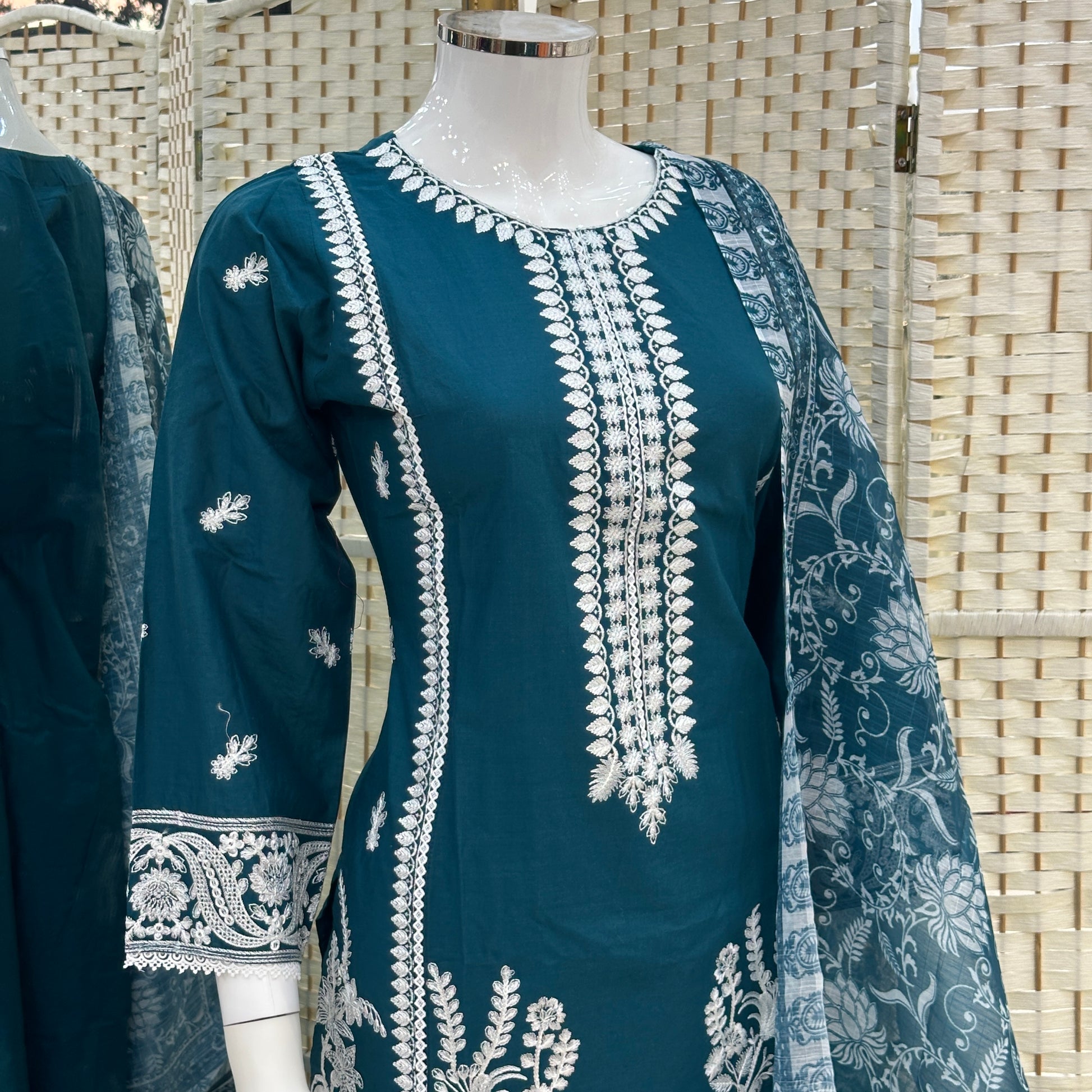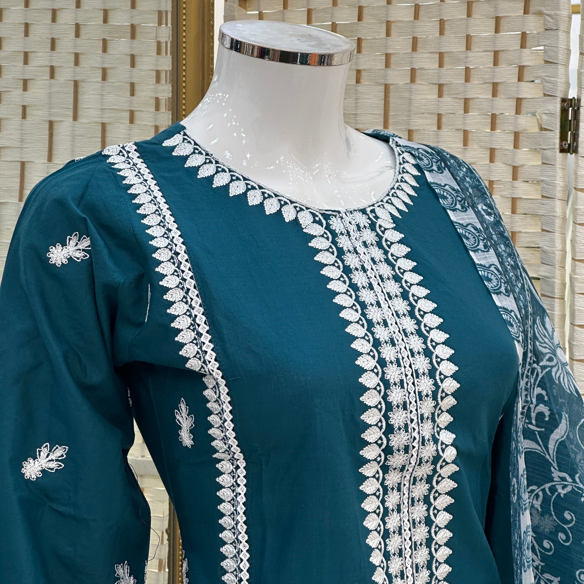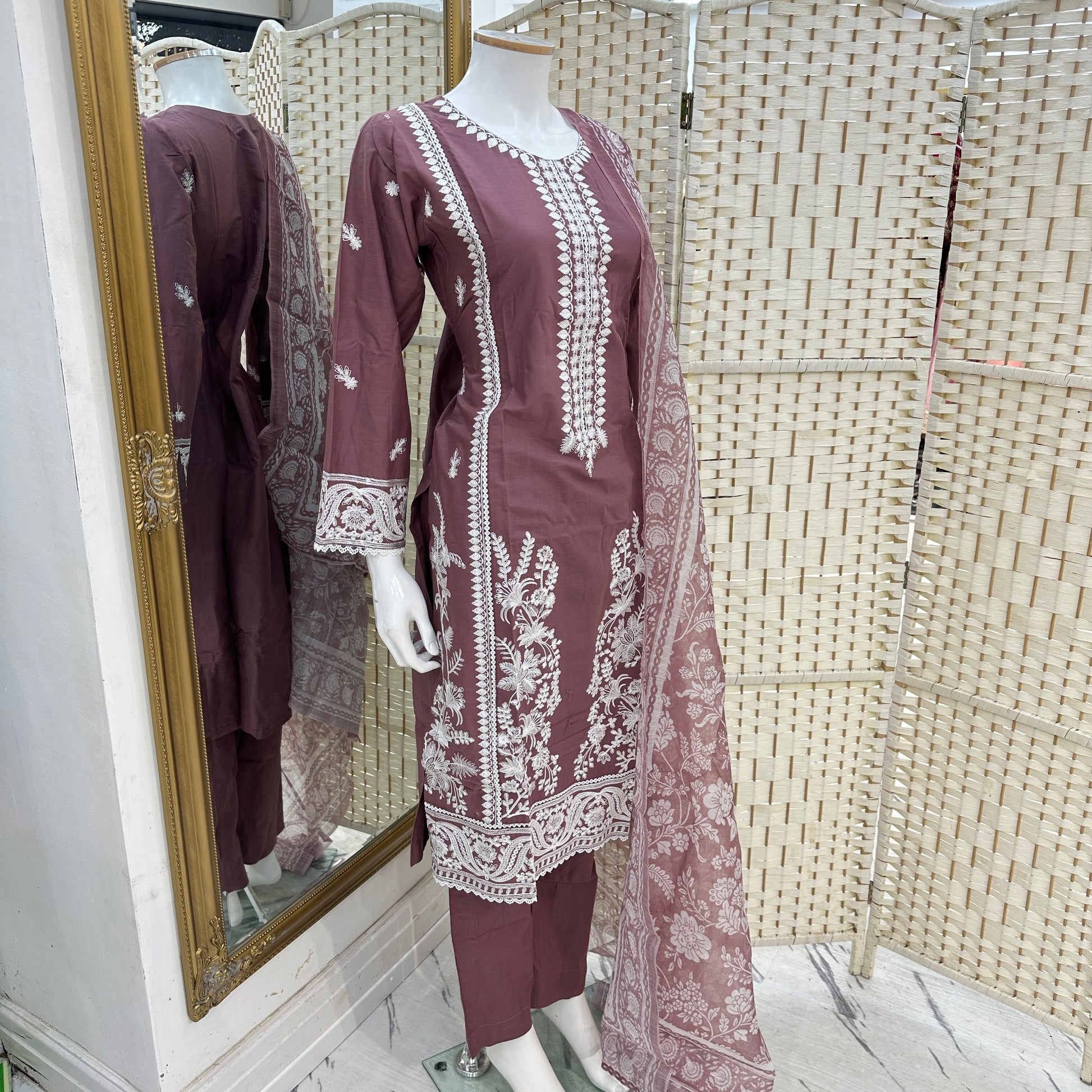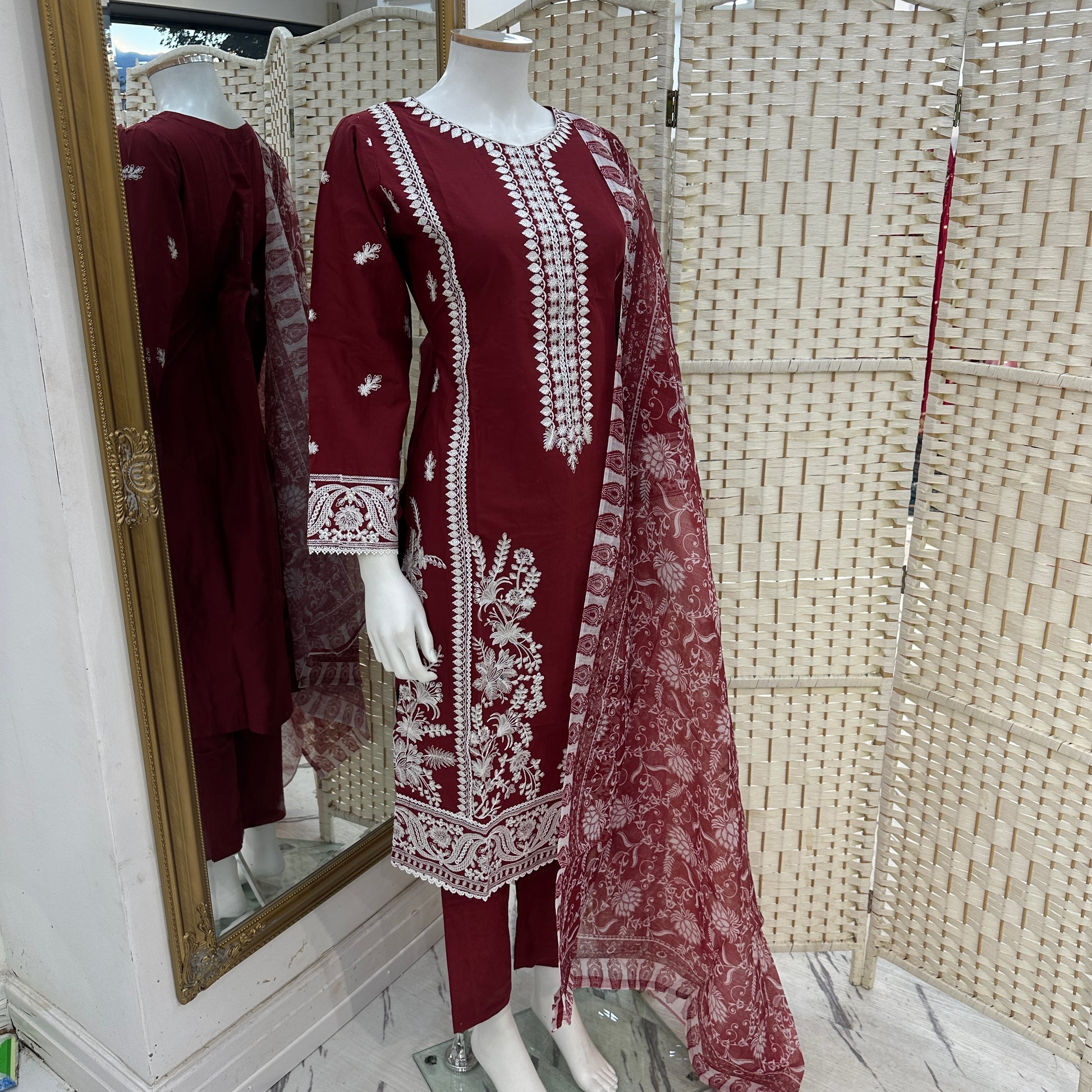 Discover our premium cotton three piece embroidered outfit. This suit features detailed thread and sequin embroidery, adding a touch of elegance. The soft digital print dupatta complements the outfit perfectly. The oversized sizes ensure a comfortable fit, while the detailed embroidery adds a luxurious finish.