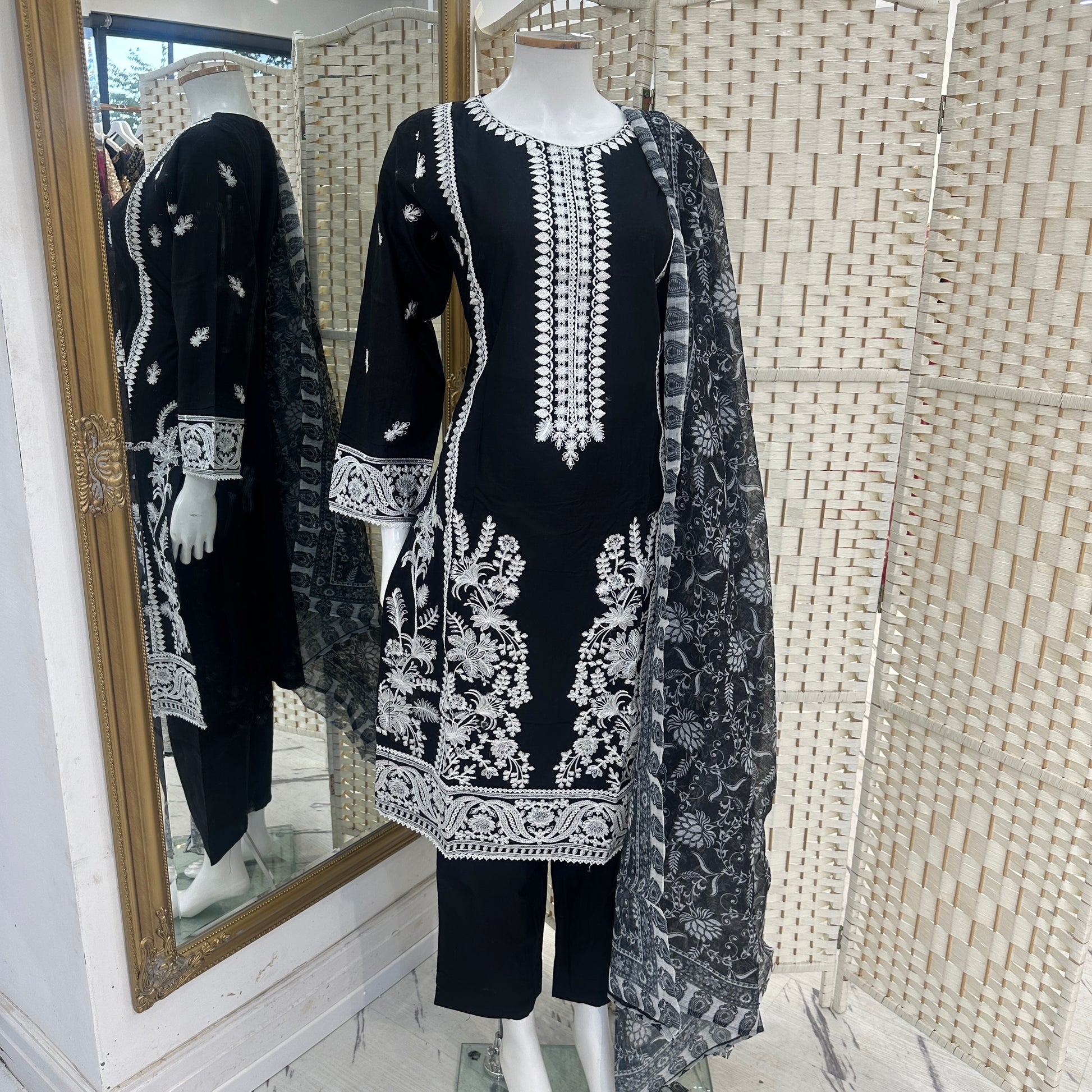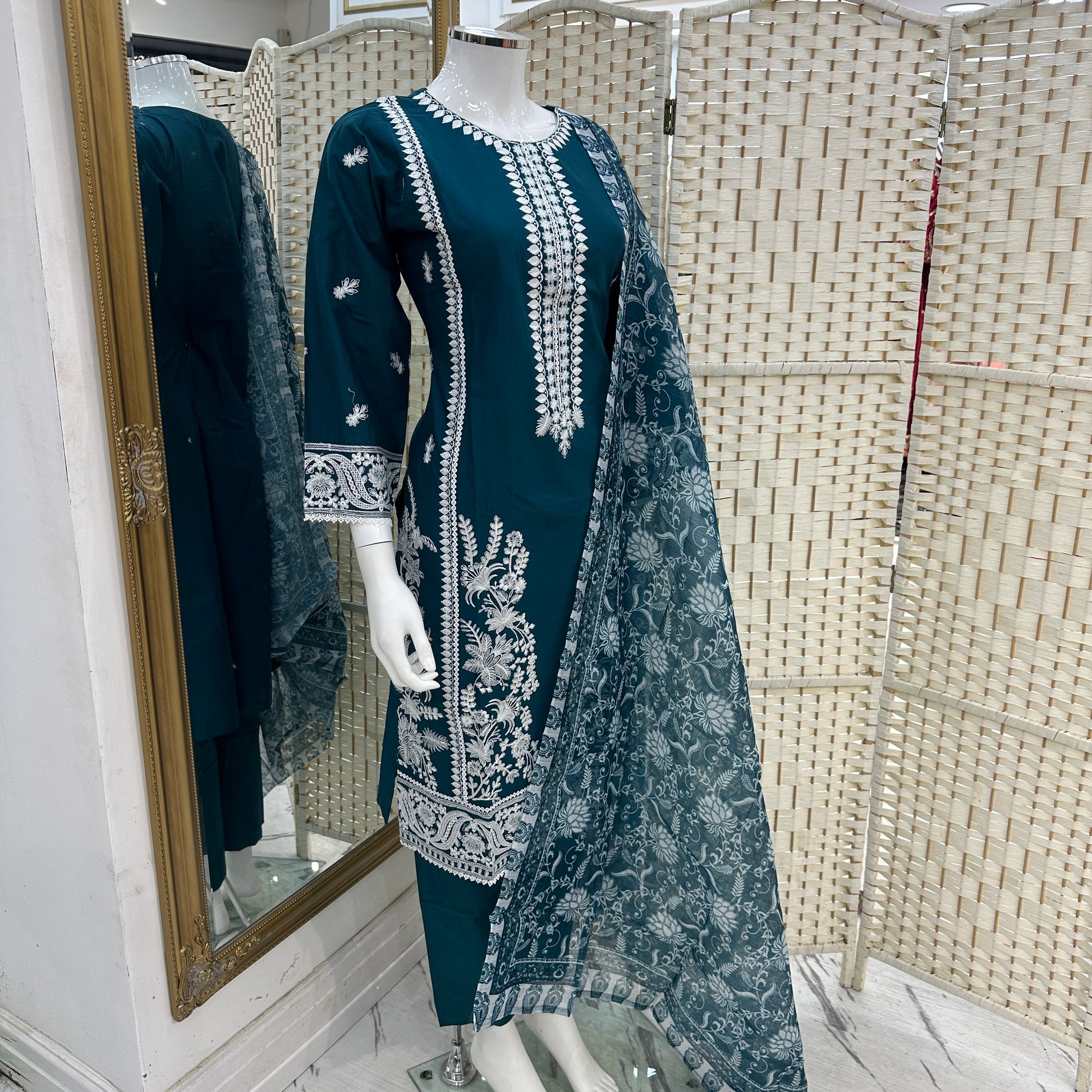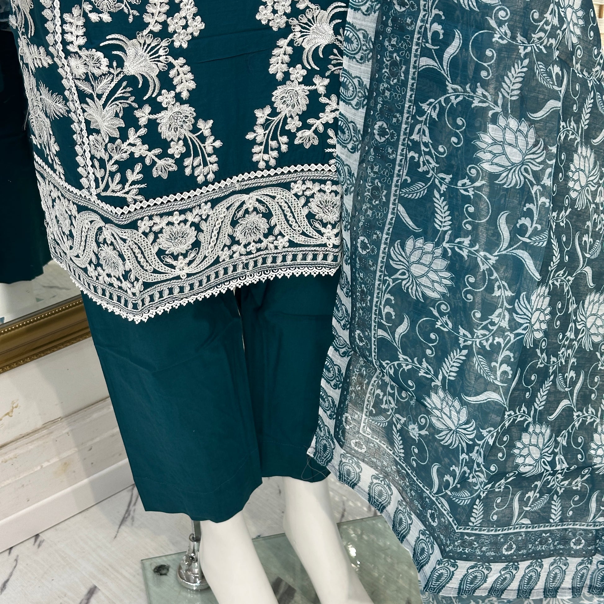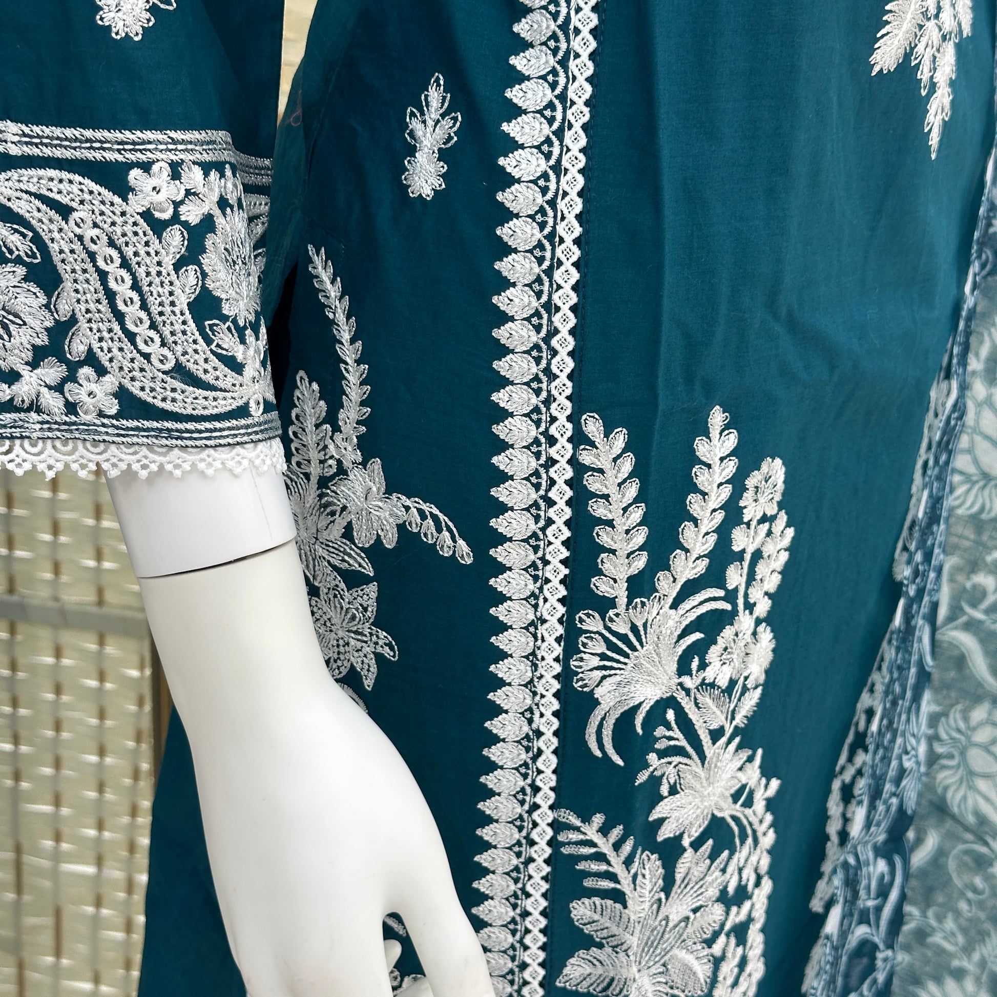 Discover our premium cotton three piece embroidered outfit. This suit features detailed thread and sequin embroidery, adding a touch of elegance. The soft digital print dupatta complements the outfit perfectly. The oversized sizes ensure a comfortable fit, while the detailed embroidery adds a luxurious finish.