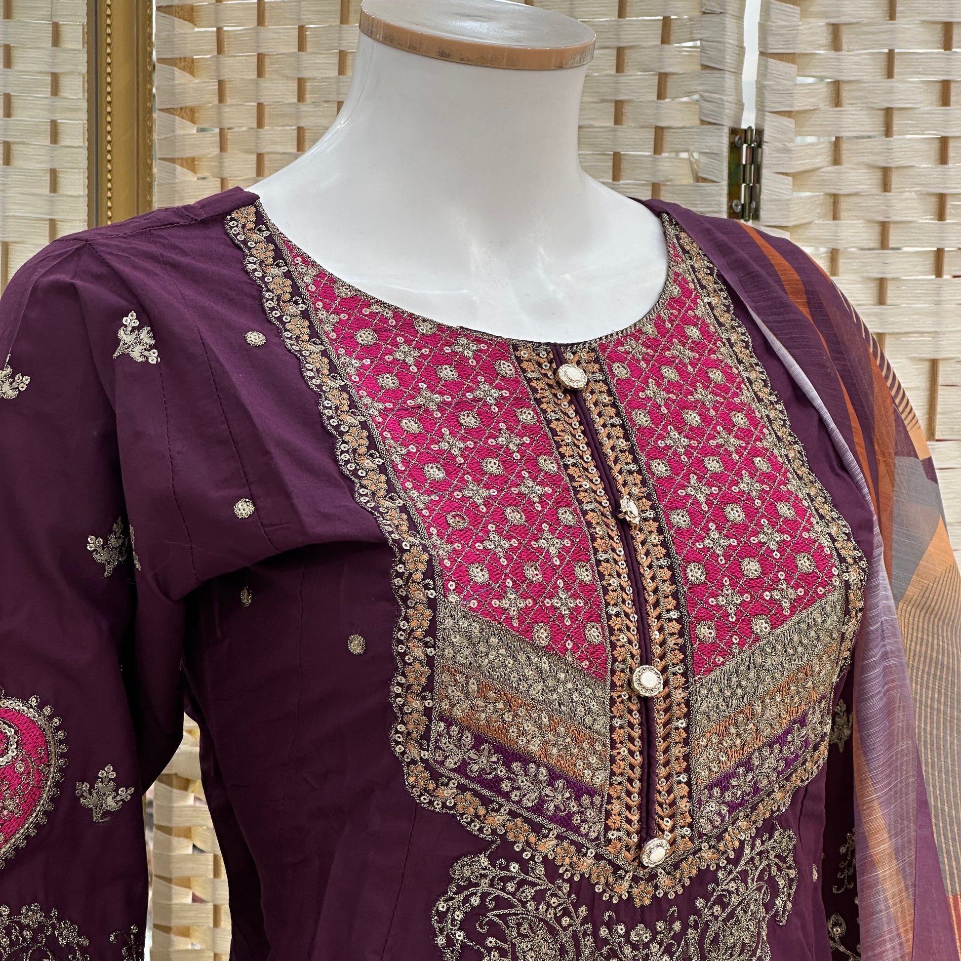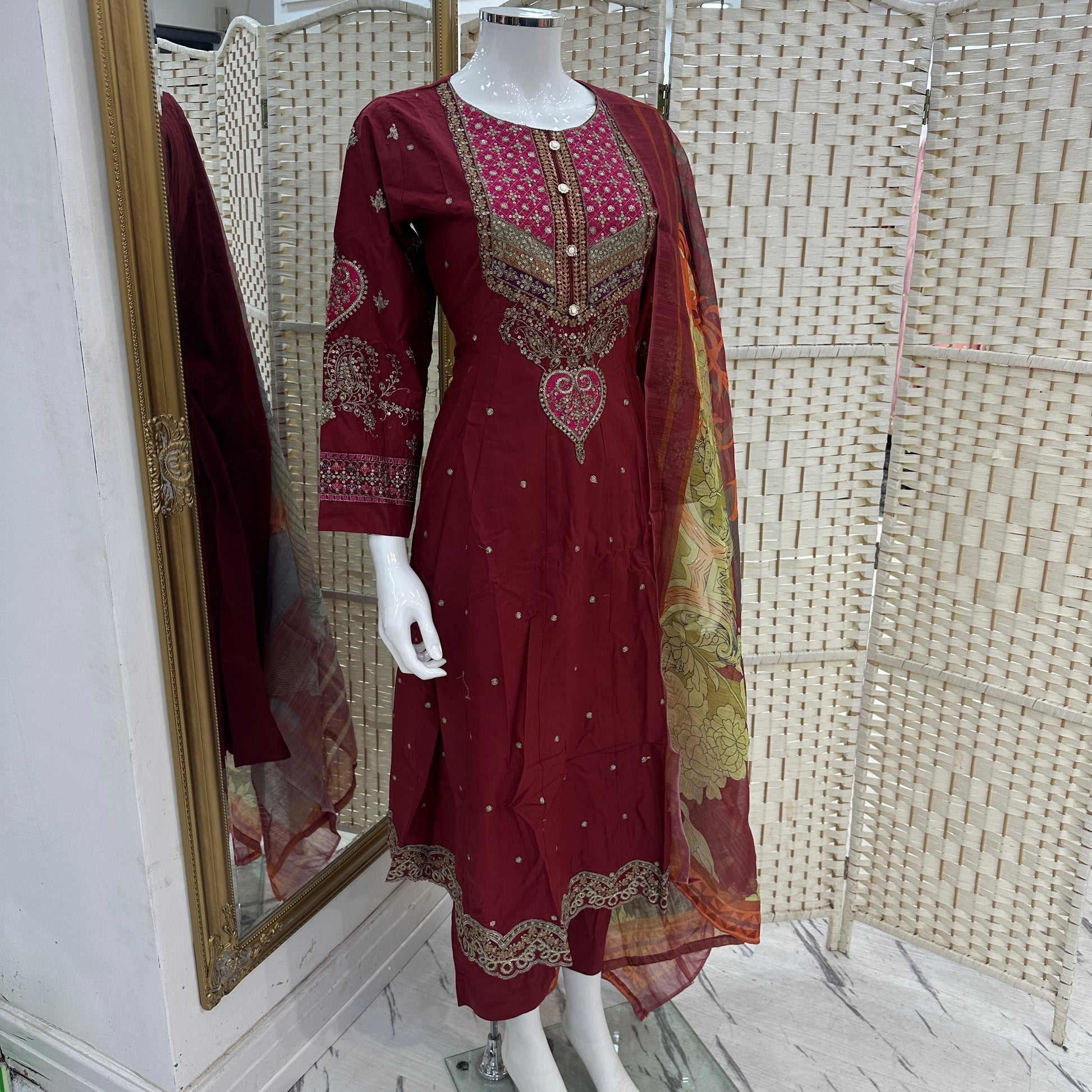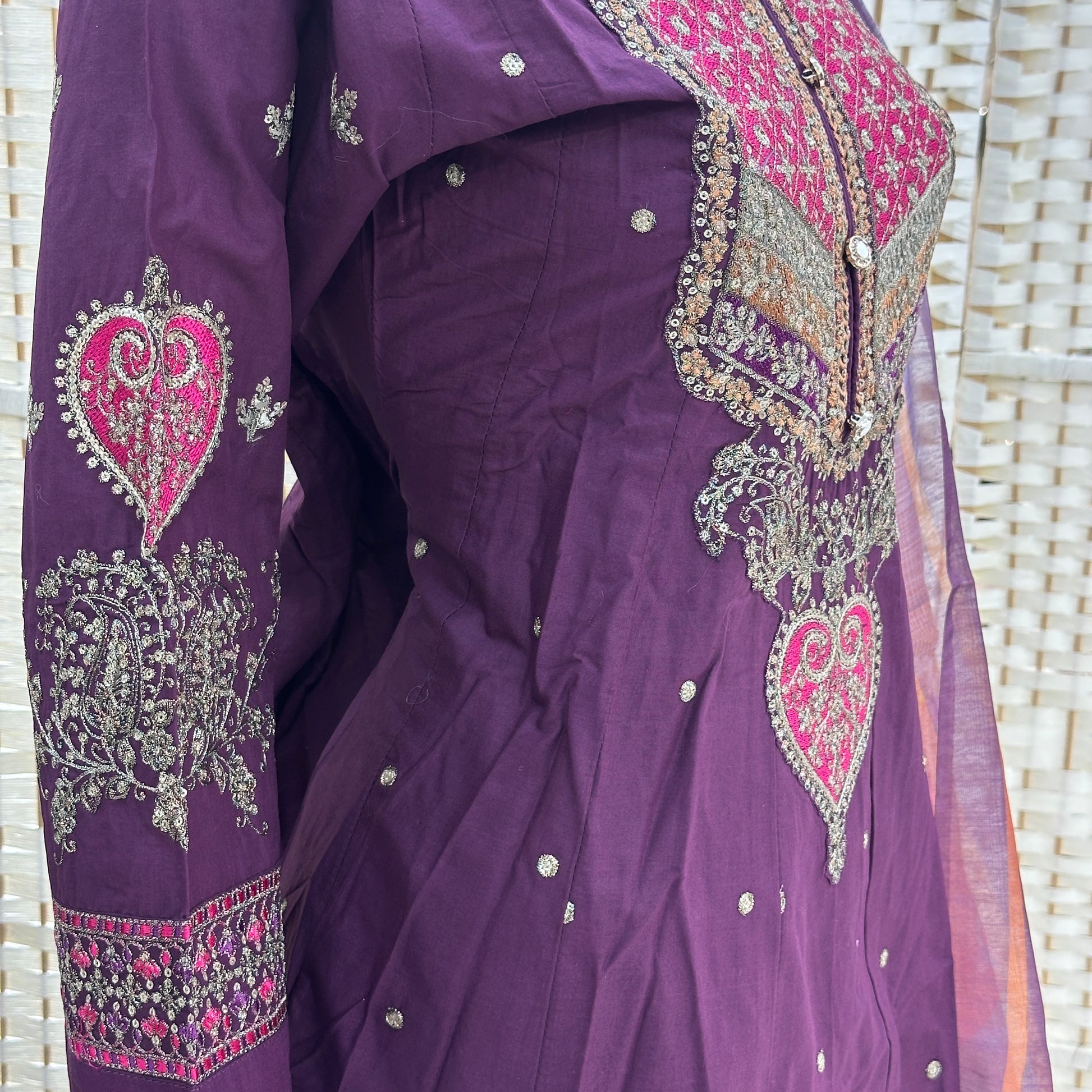 - Detailed thread and sequin embroidery.