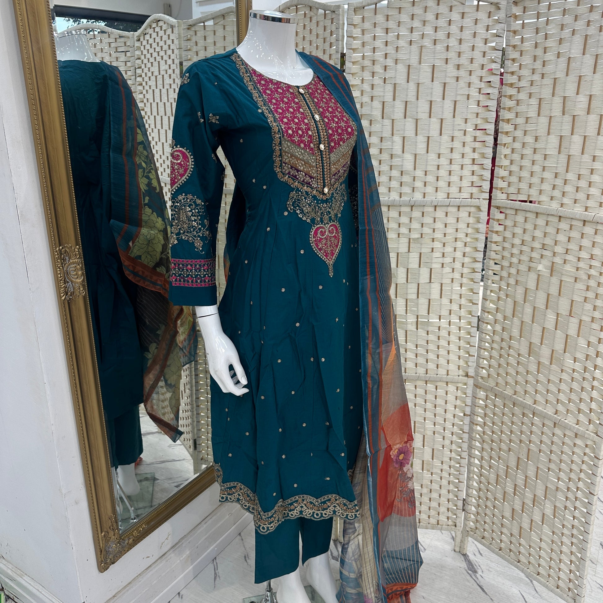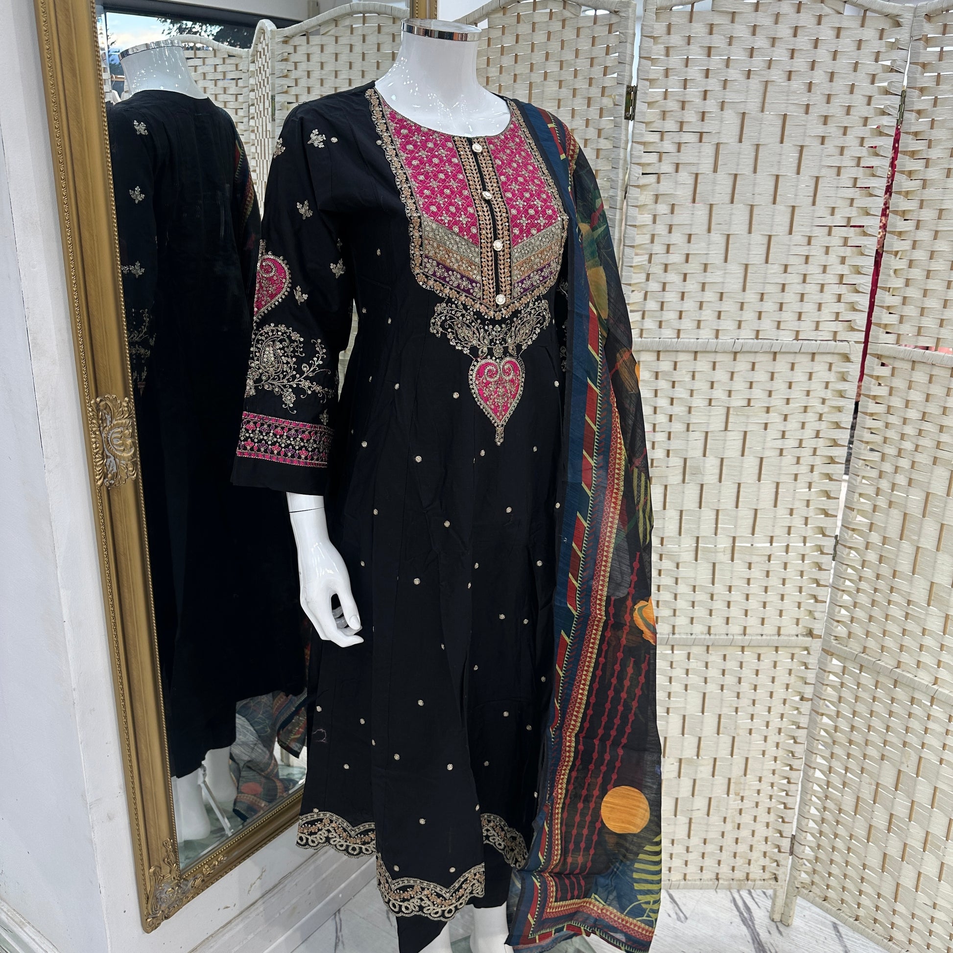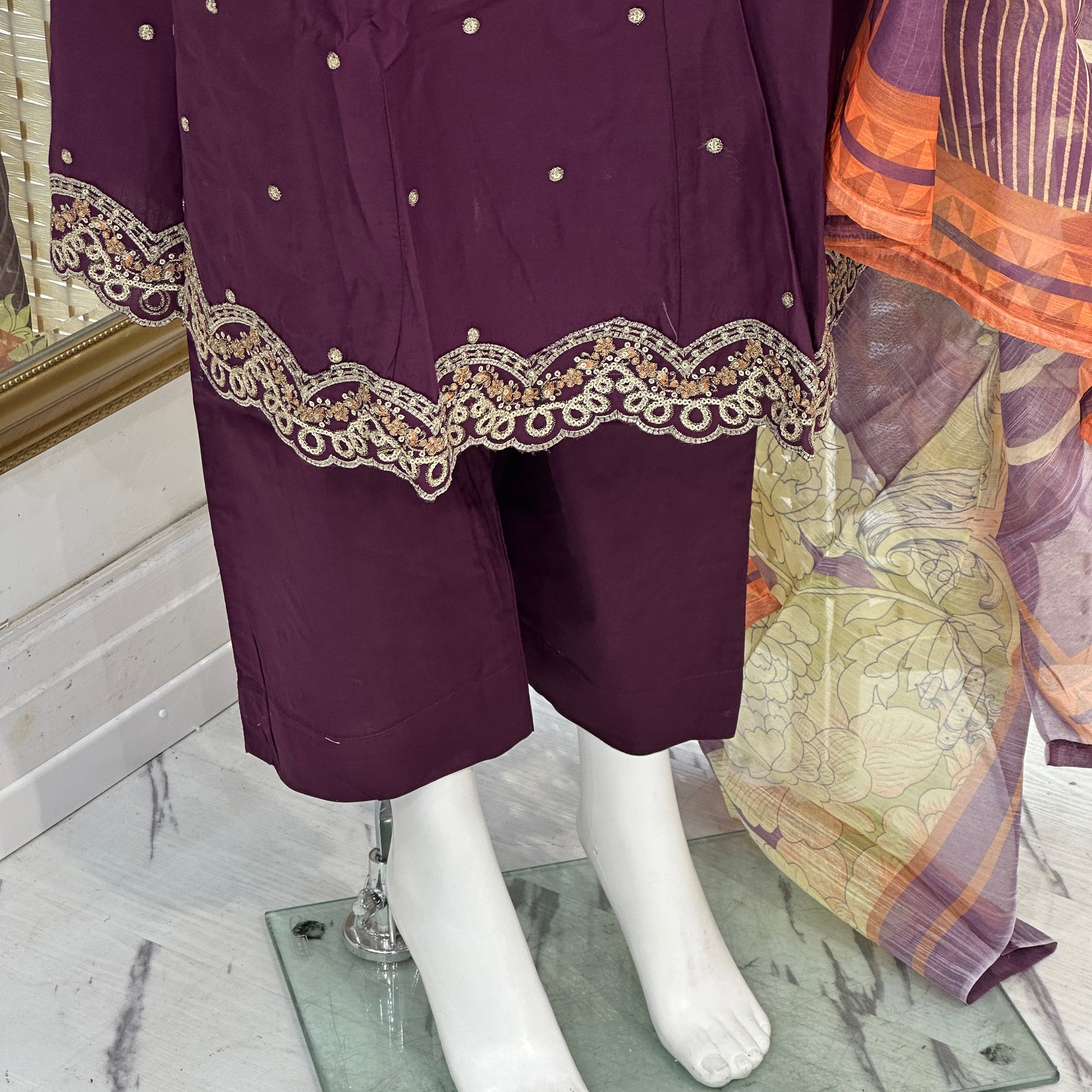 - Detailed thread and sequin embroidery.
