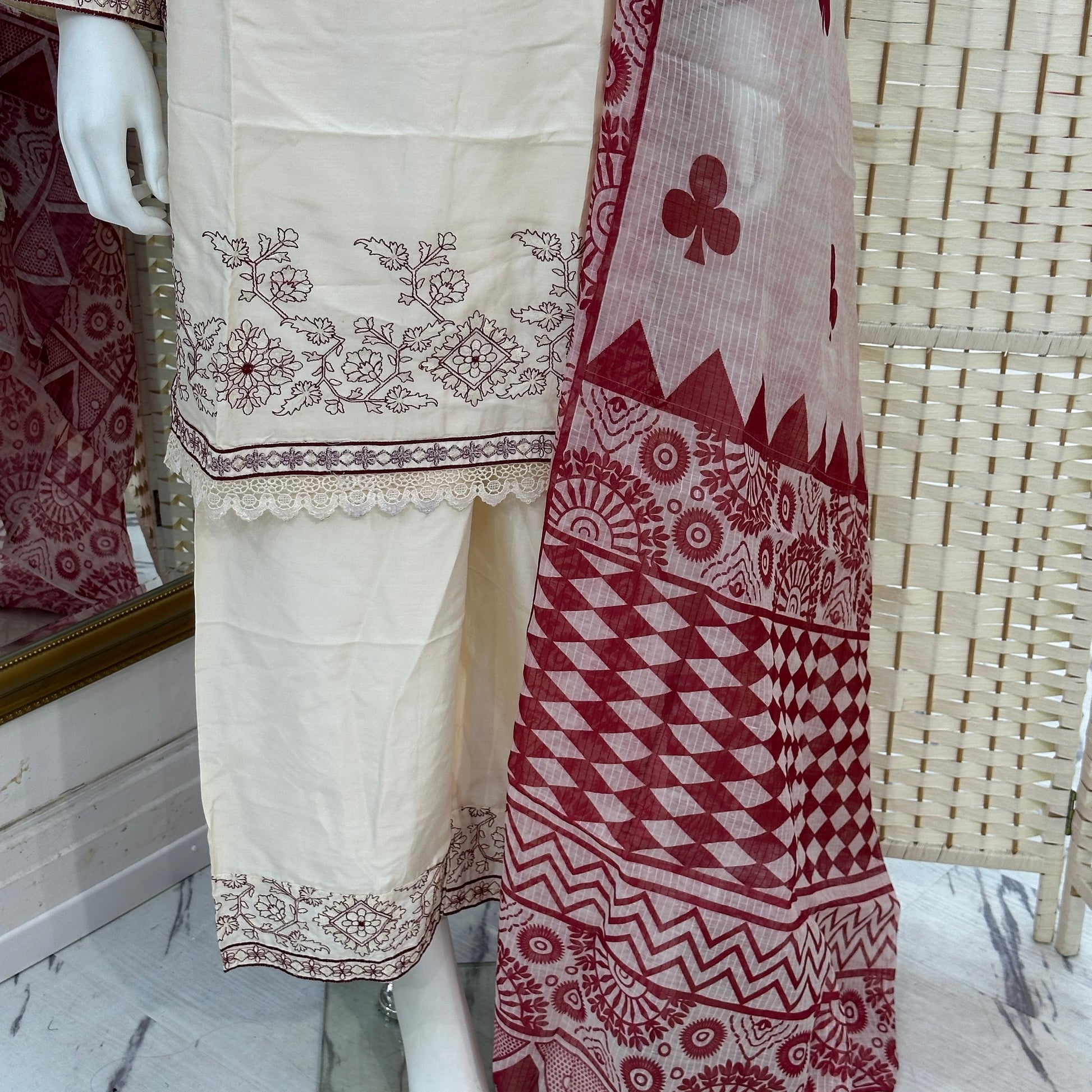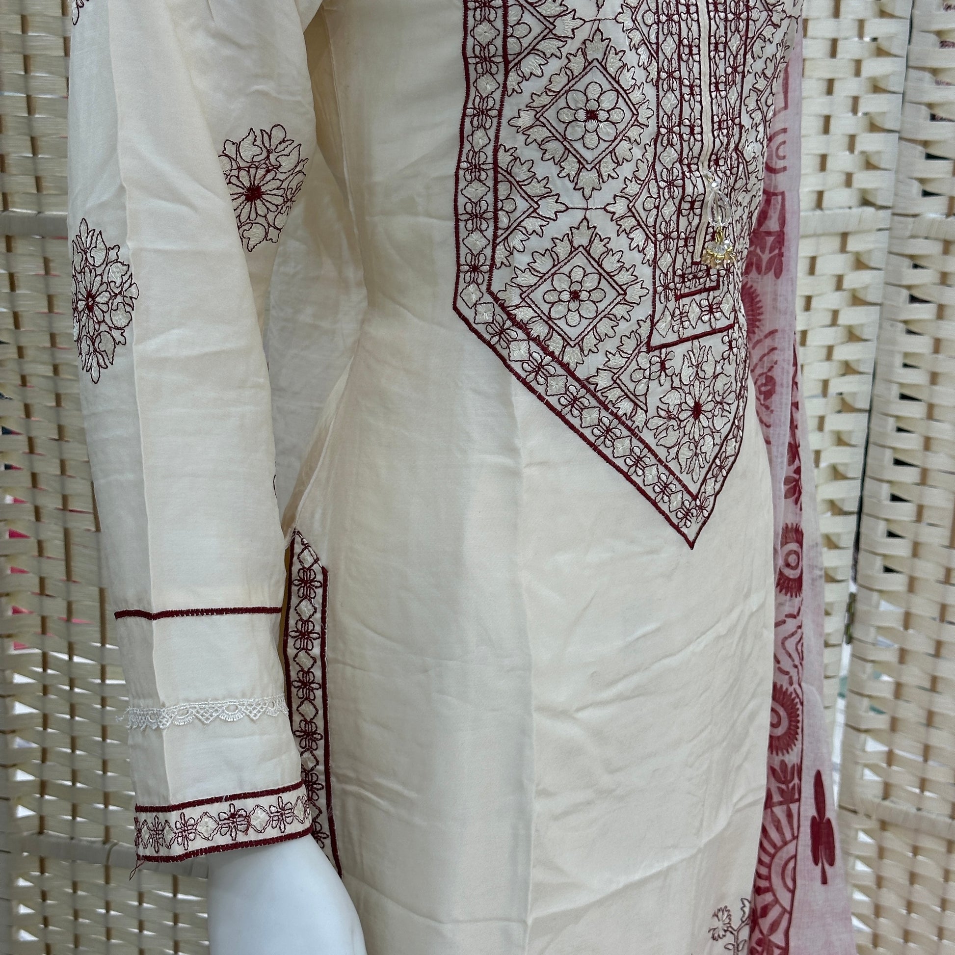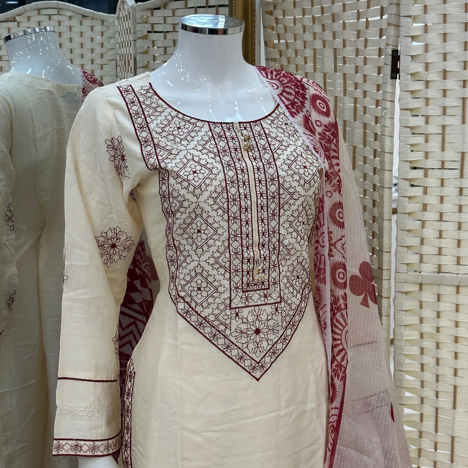 - Soft cotton embroidered three piece suit with a soft, luxurious feel.